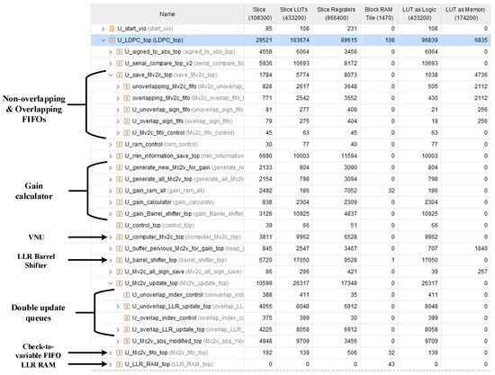 Figure 9 exhibits the resource usage of every module in the hardware implementation of the priority-based decoder with double update queues. In our decoders, only the LLR RAM, gain RAM, and check-to-variable FIFO are built with 36k BRAMs. Other FIFOs and buffers are built with Distributed RAMs (DRAMs). Thus, the 36k BRAMs used in our decoders are much less than other decoders. Although the design of double update queues seems to consume a lot of resources, the LUTs used for double update queues account for only 15.5% of the LUTs in the decoder. The FFs used for double update queues account for only 15.4% of the FFs in the decoder.