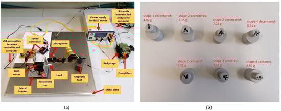 Figure 2b). The different weights with centered/decentered characteristics were considered in this work as drivers of different types of faults. In each experiment, only one of them was mounted on the motor and examined. During the experiment, the speed of the motor varied between 4000, 6000, 8000, 10,000, 12,000, and 14,000 revolutions per minute (rpm).