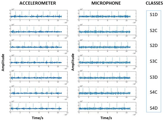 Figure 3 shows sample signals captured from the accelerometer and microphone for each class.