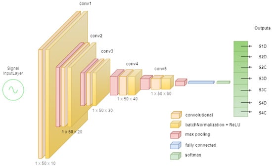 With two convolutional layers, five and ten filters, respectively, for each layer, and 1 × 20 as the filter size, the accuracy achieved by the 1D DCNN was around 70% for models trained with data from single sensors and 80% after the data fusion. To improve the results, we gradually added convolutional layers with an increasing number of filters and filter size at each step; the models improved 10% for some and 9% for others. Next, we added batch normalization layers and the nonlinear function ReLU, which performs a threshold operation on each element. The softmax activation function is used after the last fully connected layer to predict the output. We then reached an accuracy of around 100% in all cases, and we had a suitable set of parameters for the DCNN model.