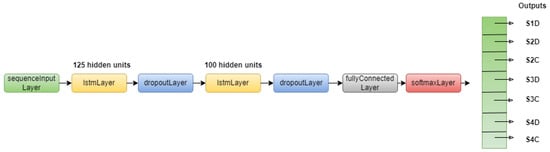 33]. The number of hidden units represents the amount of information stored between the time steps. The last two layers are used for the classification. This architecture is used with the following training options: minibatch size: 2000, max epochs: 10, optimizer: Adam [