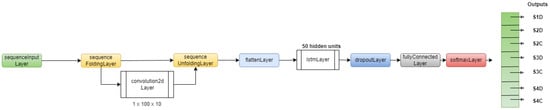 Figure 7. This architecture also takes as input the concatenation of the two types of raw signals. To automatically learn effective features suitable for tool health detection, a convolutional layer is used to perform feature extraction on the concatenation of the two input signals. To perform the convolutional operations on each time step independently, a sequence folding layer is included before the convolutional layer to convert the sequence input into an array. As the LSTM layers expect a sequence input, a sequence unfolding layer and a flattening layer are used between the convolutional layers and the LSTM layer to restore the sequence structure and reshape the output of the convolutional layers into a sequence of features. To train on our data, we used this architecture, with the following training options: minibatch size: 1000, maximum epochs: 100, optimizer: Adam [