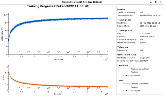 The training of the third model was performed from scratch and was progressively improved according to the observations. For example, the gradient threshold, which was set to 1 for the LSTM, was set to infinity for the CNN-LSTM because during training, we realized that the gradient threshold could exceed the set limit, thus disturbing the learning process. At this stage, the fixed threshold control method was used to stabilize the process and speed up the learning. If the method is wrongly chosen, the model will not be effective in the end. However, by setting the gradient threshold to infinity, a significant performance improvement was achieved, with a huge training time as a counterpart. From one training of the model to the next, the number of epochs increased from 60 to 100 via 80 because the learning curve had not yet reached its peak (see