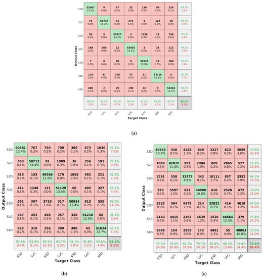 As mentioned earlier, all the methods were used to train on fused signals data. To assess the resulting models, multi-class confusion matrices were computed and Cohen’s Kappa (K) was measured according to Equation (