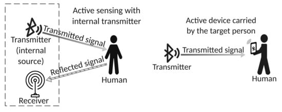 Two classes of active sensing. On the left, the sensing device is equipped with both internal probing signal transmitter and receiver. On the right, the sensed human brings an active device that receives the probing signal and produces the sensing result.