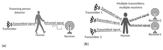 Comparing with conventional, computer-vision based approaches, such as those described in [2,3,4,5], passive remote sensing offers several important advantages. First, there is easier user acceptance, as wireless networks are not able to record images, and therefore, they are not perceived as privacy-invasive by the perspective users. Second, they have wider applicability, as wireless networks do not suffer from Line-of-Sight (LoS) obstruction and bad illumination conditions and may also support through-the-wall sensing. LoS sensing is shown in Figure 1a), whereas non-LoS sensing and through-the-wall visibility are illustrated in Figure 1b).