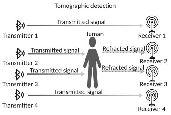 A special case is based on the radio tomographic approach, where a very high number of transmitter/receiver couples over a spacial grid (see Figure 4) allows to use imaging techniques to obtain an extremely detailed and accurate positioning of the subject [37].