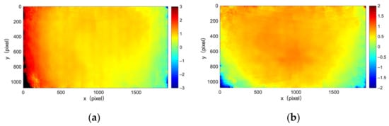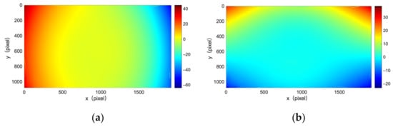 (a) Distortion rectification map of point-to-point calibration method subtracted from distortion rectification map of Zhang’s calibration method for X directions; (b) Distortion rectification map of point-to-point calibration method subtracted from distortion rectification map of Zhang’s calibration method for Y directions.
