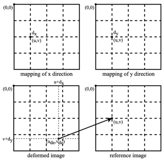 For every pixel in the projection of reference image , the DIC method can obtain the displacement of the corresponding point in distorted image taken by the camera, as in Equation (10). A group of these, , and , is illustrated in Figure 6. It is worth noting that and share the same estimation of pose corresponding to .