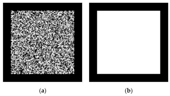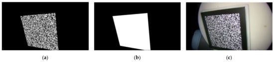Our calibration target is based on a speckle pattern synthesized from Equation (6) [39]. In Equation (6), n and D are the number and radius (unit in pixels) of speckle, respectively. (xk, yk) is the random location of the kth speckle with a random peak intensity of . The synthesized speckle pattern image is shown in Figure 4a, which is denoted as Ir. We printed it as our calibration target. Additionally, we created a mask Im with logical value representation, indicating the scope of the speckle pattern in image Ir, as displayed in Figure 4b.