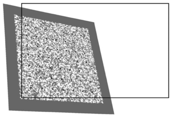With the camera to be calibrated, we captured 15–30 images of this camera calibration target; the ith image is denoted as . We allowed the speckle pattern area to extend beyond the photo’s edge. Figure 5 illustrates a calibration target’s pose in our calibration image. A rectangle outlines the image with thick solid lines. The array of black points represents control points for initial estimation. It is a noticeable principle that the speckled area can exceed the scope of the image, as shown on the left and bottom of Figure 6, but the array of control points must remain inside the scope of the image.