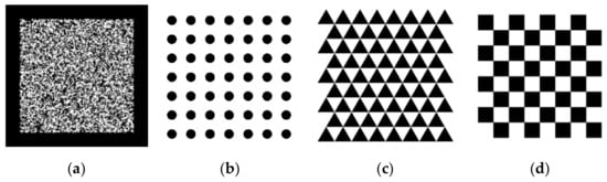 Two-dimensional targets used in the experiment, containing: (a) speckle pattern calibration target; (b) circular pattern calibration target; (c) triangle pattern calibration target; (d) chessboard pattern calibration target.