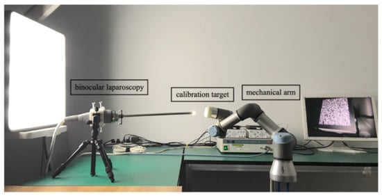 The experimental equipment was arranged as displayed in Figure 8. The calibration target was mounted on a mechanical arm, which was programmed to change its pose by inclination from −24° to 24° with a 6° interval. We positioned the calibration target initially in such a way that its projection covered the entire image area. The calculations were performed on a server with 256 CPUs and 512 GB of memory.