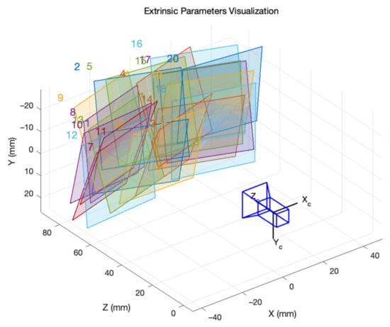 To investigate our method’s performance for each kind of calibration target, we grouped 20 images of different poses. For this, the poses of selected images had to be various, and all selected images had to cover the whole field of view. Figure 9 displays the poses of a group of selected images. We selected 10 groups of images as a training set.