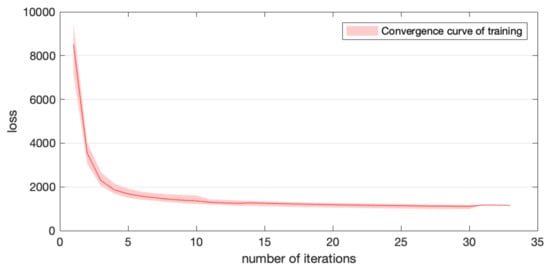 Here, we verified the stability of our optimization’s convergence under different initialization conditions by 10 training sets. The initial estimation was made by Zhang’s calibration method. Then, optimization using our novel objective function was performed, and a convergence curve was recorded. Figure 10 displays the average value and range of the convergence curve in 10 training processes. The vertical axis represents the value of the objective function described in Equations (11)–(13).