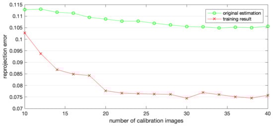 Additionally, we examined the distortion calibration results when different numbers of calibration images were utilized. For this purpose, the camera was calibrated 16 times, using from 10 to 40 calibration images. Then, training set images, undistorted by a distortion rectification map, were calibrated using Zhang’s calibration method, assuming no distortion remains. The reprojection error was recorded, indicating the accuracy of the distortion rectification map. Figure 11 illustrates the reprojection error of calibration using different numbers of calibration images. The reprojection error calculated from training results was smaller than the initial estimation, even when only 10 images were utilized, and remained stable when more than 20 images were used.