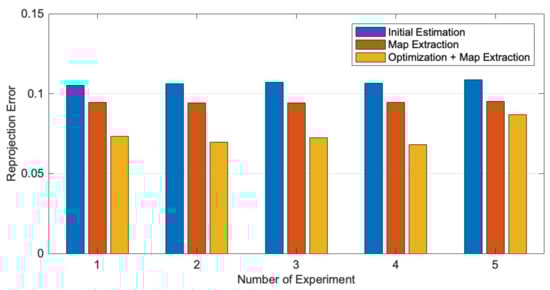 As listed in Table 1, the mean reprojection error of Map Extraction was reduced by 11.48%, compared to the result of the Initial Estimation. The last configuration contained our complete calibration progress, with a mean reprojection error reduction of 30.61% compared to the initial estimation result. The reprojection errors’ distribution in 5 repeated ablation experiments is showed in Figure 12. As a result, it can be inferred that in our method, both the optimizations with novel objective functions and the calculation of a point-to-point distortion rectification map are critical for improving calibration accuracy.