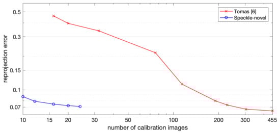 Reprojection error of Thomas S. et al.’s method and our point-to-point distortion calibration method on test set when different numbers of calibration images are used.