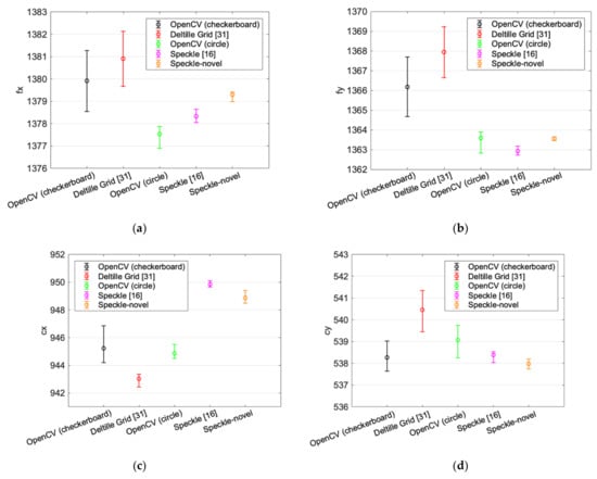 Distributions of internal parameters were estimated using different calibration methods. (a–d) are the distribution of estimated fx, fy, cx, and cy, respectively.
