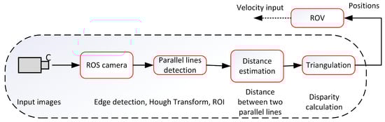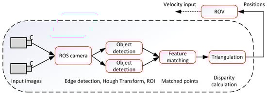 In Figure 1, a schematic of Method 1 is shown. The forward-looking (left and right) cameras installed on the vehicle are used to collect the image sequences. The “cv-bridge” package is used to convert the obtained images from ROS to OpenCV formats. Next, the obtained images are forwarded to the object detector that extracts the net and draws a bounding box around the region of interest (ROI) using a canny edge detection algorithm. Next, from the right image, the image SURF features are extracted from the bounding box and searched in the corresponding bounding box of the left image along the horizontal lines. The matched points are used to compute the disparity map based on the triangulation method. Finally, the disparity map is used to obtain the relative positions of the vehicle with the objective to traverse the net from top to bottom while keeping a safe distance from it.
