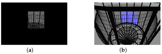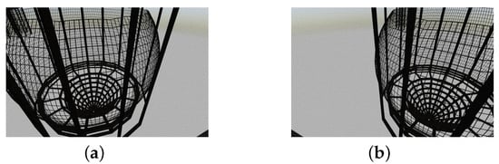 By following the stereo and monocular imaging design, the two forward-looking cameras were used during images acquisition with the objective of testing the vision-based auto-inspection of the net structure. The simulation setup is shown in Figure 10 where the vehicle model is cloned in the underwater scene and facing toward the net plane.
