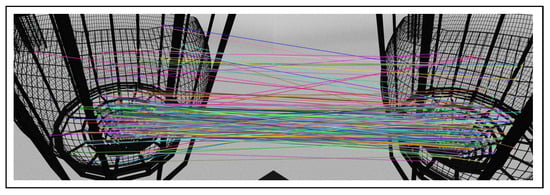 The next step is to design the stereo vision system. Here, the epipolar geometry concept is employed. The basic idea of the system is to search the SURF features in the bounding box containing the detected edges in the right image. SURF features are a scale and rotation-invariant interest point detector and descriptor []. Next, the same feature extraction steps are followed in the bounding box by considering horizontal scale lines corresponding to the left image. The next phase is to perform feature matching and find the best match in the corresponding left and right images. For points matching purposes, the K-Nearest Neighbour routine by OpenCV is used, and a filter is applied to detect only the best matches. Those are the ones that have a constant distance less than 0.6, and they are labeled as a best-matched point. Finally, the best match points are obtained and drawn as shown in Figure 5.