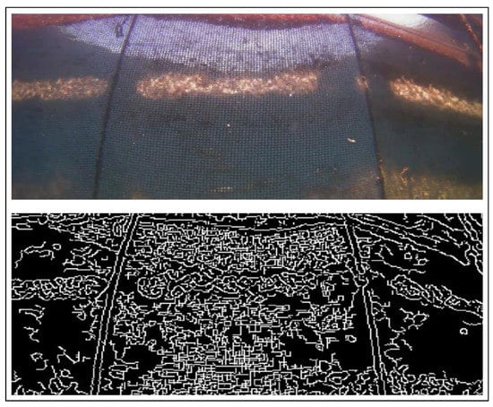 Next, we can recover the edges in the ROI image by calling up the “Canny” edge detection algorithm. The Canny algorithm is a popular mathematical operator that finds prominent edges in images using a multi-stage approach consisting of noise reduction, finding intensities, non-maximum suppression and thresholding. This step is required to check if there are enough pixels related to the net area inside the selected ROI. Otherwise, the search and extraction of the features of interest may not be effective. The final result containing strong edges in the image is shown in Figure 4.