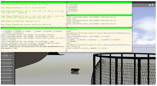In the simulator, the vehicle model named “rexrov-default” was used that consists of a mechanical based with two cameras and other sensing devices, e.g., inertial measurement unit (IMU) and LIDAR. Furthermore, the Doppler velocity log (DVL) was also available to measure the vehicle velocity during the simulation. The model also consisted of the implementation of Fossen’s motion equations for the vehicle [] and the thruster management package.