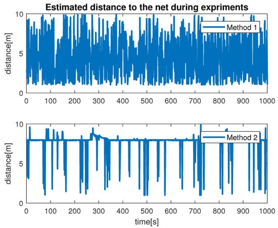 The proposed scheme follows a modular approach consisting of two modules. The first module is responsible for distance estimation using traditional computer vision techniques. The second module is responsible to guide and control the vehicle movement along the net plane to inspect its status. In this work, two different designs are investigated, namely Method 1 and Method 2, based on the camera use. There are a certain number of other applications that can profit from the proposed visual control strategies, see, e.g., [,,].