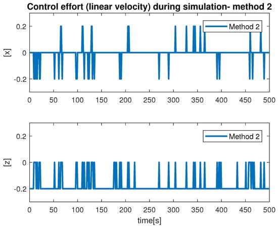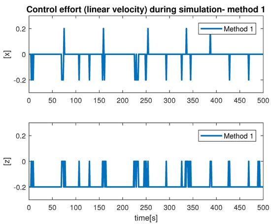 During the simulation, we observed the estimation of the distance between the vehicle camera and the net plane via Method 1 and Method 2. This is shown in Figure 12. From our results, we found that the monocular image-based method produced smooth results compared with the stereo-image-based method. The signal produced by Method 1 had multiple abrupt changes during the simulation. This was due to the fact that if the obtained images were blurred or not flat, the scheme extract features incorrectly caused the ambiguous estimation. From our experiments, we learned that Method 1 is highly influenced by the choice of hardware, feature extraction and computation cost. In contrast, Method 2 showed reasonable performance for the distance estimation. We can conclude that Method 2, which makes use of the monocular imaging design technique, is feasible for tracking underwater fish net pens at sea. The second test that we performed was finalized to observe the vehicle states during the simulation. This is shown in Figure 13, where the vehicle positions (x, y, z and yaw) achieved by applying Method 1 and Method 2 can be seen. In terms of performance, we noticed that Method 2 showed better performance compared to Method 1. This can be seen more clearly in the state x and angle . With Method 1, the path covered was not linear despite the absence of external noise imposed in the control path. Furthermore, the state z confirmed the top/down traversing during the simulation. From our results, we can conclude that Method 2 is more suitable to be used for tracking. The third test was organized to analyze the velocity profiles during the simulation. This is shown in Figure 14 and Figure 15. Here, the results show the velocity set points for x and z. The x set point was used for the longitudinal movement while the z set poin twas used for the depth movement of the vehicle. The results confirm that whenever the vehicle stays at the desired distance from the net, the controller generates the z velocity set point correctly. From our analysis, we can conclude that the proposed schemes could be used to address the tracking problem.