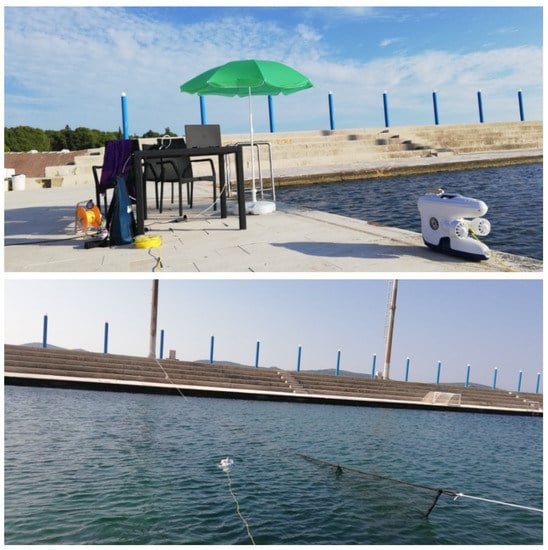 To test the proposed Method 2 scheme in a real environment setting, a small set of experiments were conducted during the workshop “BTS (Breaking the Surface) 2022” organized by the Laboratory for Underwater Systems and Technologies (LABUST) at the Faculty of Electrical Engineering and Computing, University of Zagreb in October 2021 at Biograde de Muro, Croatia. The experiments were performed in the pool setup as shown in Figure 16.