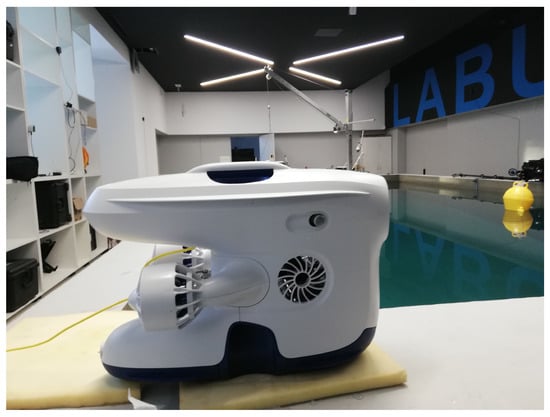Blueye Pro ROV as shown in Figure 17 was acquired from the LABUST during the experiments. The Blueye Pro ROV is produced by Blueye Robotics and has dimensions of 48.5 × 25.7 × 35.4 cm length, width and height, respectively. The ROV weighs 9 kg, it can go down to 300 m depth, and it has a 400 m cable for tethering. It is also equipped with a battery allowing 2 h of autonomy. The ROV can be used in saltwater, brackish, or freshwater. The drone moves with help of the available four thrusters of 350 w.