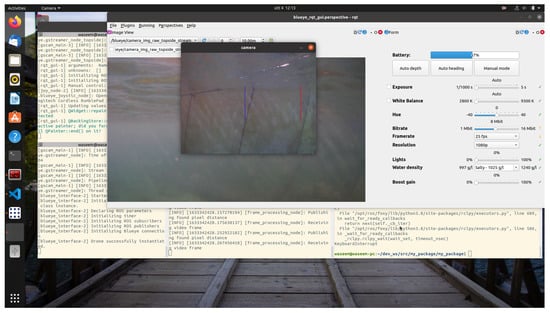 The ROV has a full HD forward-looking camera with a [−30 deg, 30 deg] tilt angle and 25–30 fps imaging capability. Additionally, it is equipped with a powerful light that ensures well-lit imagery under low-light scenarios. Other sensory devices including IMU, accelerometer, compass and temperature are also installed on it. The ROV allows control and communication with a topside user on the surface through both WiFi and Ethernet cable in a wireless environment []. Furthermore, the ROV is integrated with an open-source BlueyeSDK-ROS2 interface (see []). This allowed for achieving a connection between the Python-based ROS nodes running on a topside computer and the ROV.