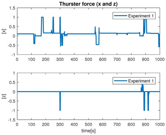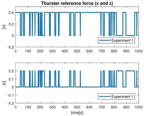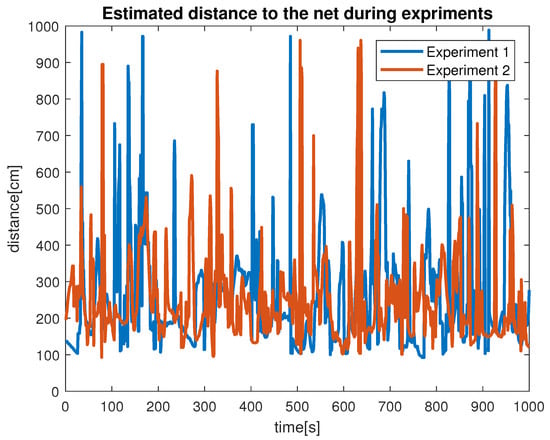 Despite the above-mentioned challenges, the vehicle was used for the distance estimation of the vehicle relative to the fish net pens in a field trial as shown in Figure 16, and some results were collected. In Figure 19 the running interface is shown. In the figure, one can clearly see that the algorithm is working by identifying the ropes as two parallel lines in the input image. Next, these lines are used to estimate the distance to the fish net pens. The estimated distance is shown in Figure 20. The reference distance used during the experiments was 200 cm, and based on the current distance, the vehicle was instructed to move forward/backward. While the vehicle got in range of the wanted distance, the top to down motion was called. Here, we performed two different experiments and examined the estimated distance. The results show similar performance from both experiments. However, false estimation was also observed during the experiments. By clearly examining the results and after tuning the algorithm parameters, we concluded that the estimation process is influenced by the input data. From the experiments, we learned that the algorithm was showing performance degradation with sunlight and poor weather. Moreover, the distance estimation data showed that the proposed scheme was capableof being used for the distance estimation and tracking of the fish cage net. For thoroughness, the thruster force profiles during Experiments 1 and Experiments 2 are shown in Figure 21 and Figure 22, respectively. Here, the results confirmed that the control part successfully generated the velocity set point x and z whenever necessary on the basis of the reference distance.