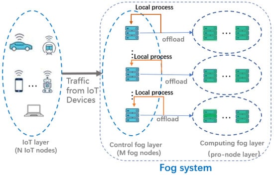 With the evolution of technology, people’s lives are surrounded by a greater number of IoT devices. Data in IoT are also growing exponentially. If all this traffic is handed over to the cloud, the computing pressure on the cloud will be enormous [1]. Therefore, fog computing has arisen, first, to use the idle resources of IoT devices, second, to reduce the flow of cloud center network, and third, to reduce the delay of tasks. So far, fog network has been widely applied, including to the Internet of vehicles, smart buildings, smart cities, and industrial automation. A large number of application scenarios produce a large number of task requirements [2,3,4]. Among them, delay-sensitive tasks pose a great challenge to the computing capability of nodes. If the task cannot be completed within the specified time, it will be meaningless even if the task is completed. Therefore, the task needs to be offloaded into the fog network, and the nodes in the fog network can help the calculations [5].