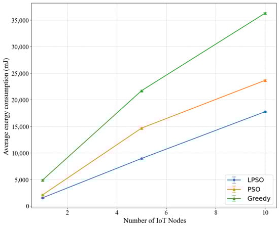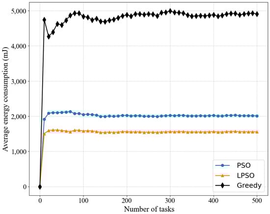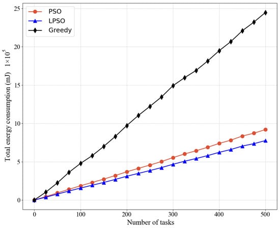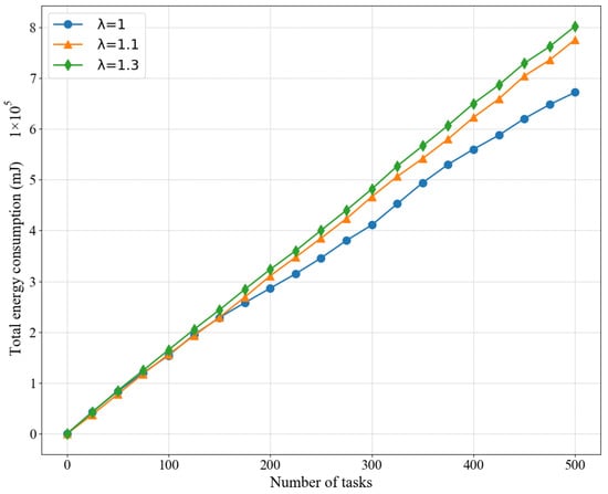 In addition, we also compared the energy consumption of LPSO for different arrival rates, as shown in Figure 6, and as expected, the higher the value of the arrival rate , the more energy is consumed. Here we set the weight V = 50 because LPSO performs best at V = 50. A higher arrival rate leads to more computational tasks competing for the limited network and computing resources, thus increasing the queuing time of the computing workload, which requires more computing resources to ensure that it can be completed within the specified time.