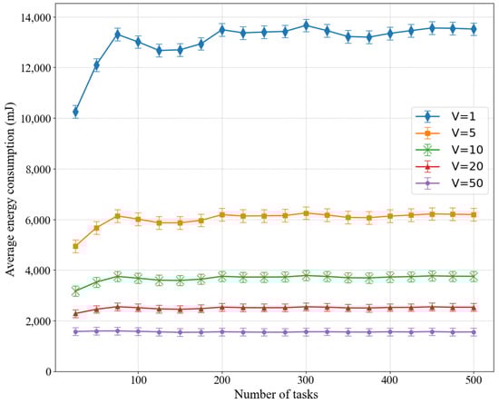 We also studied the average energy consumption of LPSO for different weights V in Figure 3. The performance varies at different weights, with the highest energy consumption at V = 1 and the lowest energy consumption at V = 50, where V is the weight parameter for energy consumption, and a larger value of V means that the energy consumption value has a greater impact on the objective value. This is because when the value of V increases, a small decrease in energy consumption leads to a large decrease in the value of the objective function, and then the optimization process tends to reduce the value of the energy consumption, which leads to a lower value of the objective function. In the experiments, we considered the standard deviation and the arrival rate .