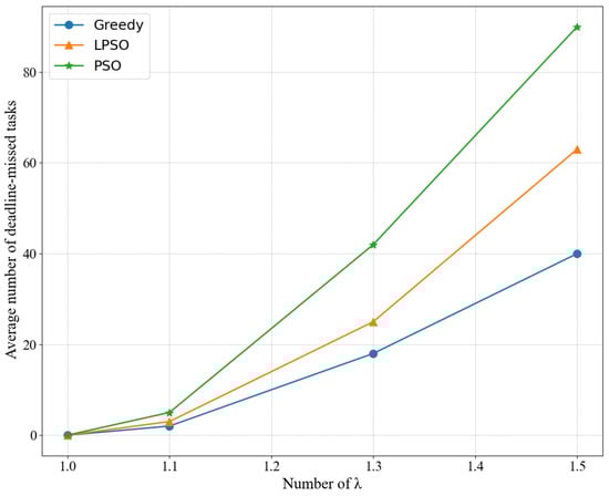 Finally, Figure 7 shows the completion degree of different algorithms under different arrival rates. When all conditions are the same, including the number of nodes, task size, and task delay, we can compare LPSO and the other algorithms in the number of tasks completed at different task arrival rates. LPSO performs better than PSO because PSO only considers the most ideal resource allocation scenario (i.e., each task just has to match its requirements), which causes the queue to block. This leads to an increase in queuing time, and LPSO combines the optimization of computing resources and channel resources in the case of a long time, where every time slot maximizes the use of resources while keeping the queue stable. Moreover, the reason why the greedy algorithm does not complete tasks on time is because it completes as many tasks as possible; in other words, all the equipment power is turned on to the maximum, and the energy consumption is exchanged for the number of completed tasks.