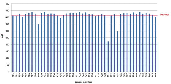 Response of all 46 sensors in terms of computed ACI. The red line represents the average value, <ACI.