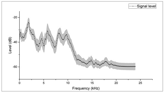 Frequency response of the 22 selected sensors: average spectrum and standard deviation (grey band). The frequency range is 0–24 kHz.