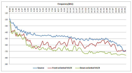 Frequency response of a single VLCR exposed at different orientations with respect to the incident sound source (blue line) generated with the Audacity software. The downward oriented response (green line) yields a better correlated response with the source signal due to the mounting position of the microphone embedded in the VLCR.