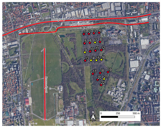 Area of study at the Parco Nord of Milan with indication of the measuring sites. Red spots indicate the active recording sites, yellow spots indicate sites where the recordings failed. Furthermore, the following are highlighted: the A4 highway, Padre Turoldo Street and the Bresso airport runaway.