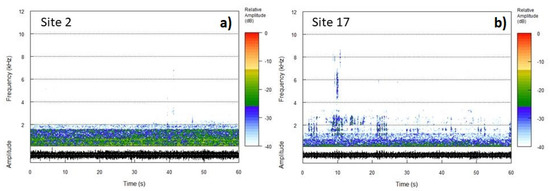 Spectrogram of two simultaneous recordings taken at Site 2 (panel (a)) and Site 17 ( panel (b)) showing the different contributions of traffic noise at the two sites.