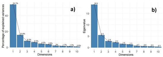 Properties of the first ten principal components: (a) percentage of explained variance vs. dimensions; (b) eigenvalues vs. dimensions. The cumulative contribution of explained variance, V, of the first three dimensions is .