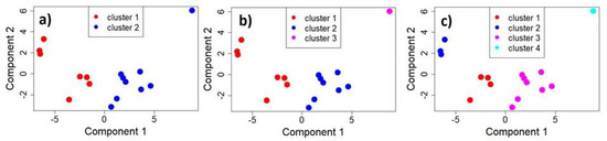 Multi-dimensional scaling (MDS) applied to the k-means clustered data to provide a visual representation of the pattern of proximities among data. (a): two clusters; (b): three clusters; and (c): four clusters.