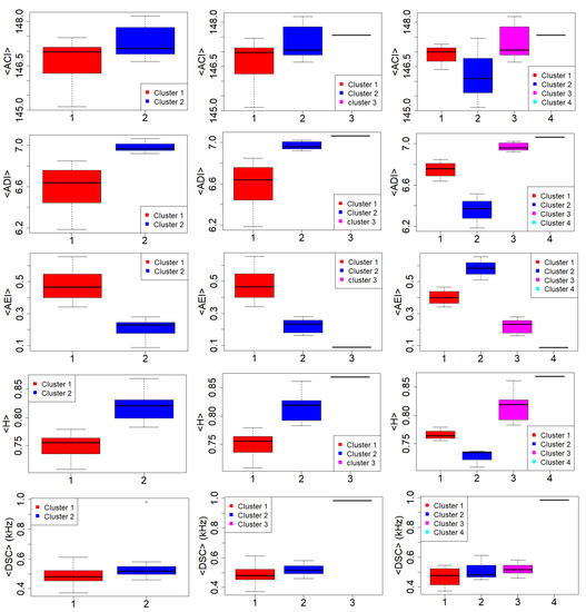 Figure 9 illustrates the multi-dimensional scaling (MDS) results applied to the k-means clustered data to provide a visual representation of the pattern of proximities among the data [54] for the three selected solutions. The distinction between clusters, marked by different colours, is rather satisfactory. Figure 10 illustrates the boxplots of the original mean eco-acoustic indices split into the different cluster: 2 (left column), 3 (central column), 4 (right column).