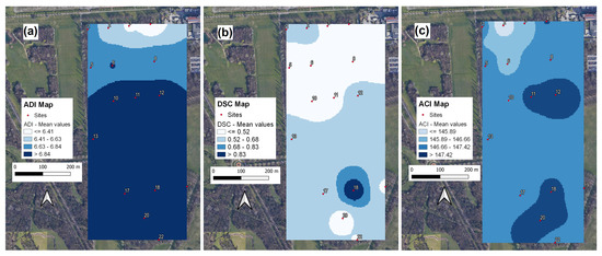 Spatial maps corresponding to: (a) ADI; (b) DSC; and (c) ACI. Colours refer to four equally spaced classes of values.