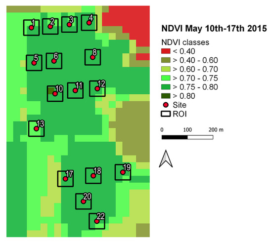 The image downloaded refers to the period of 10–17 May 2015. A map of the Normalised Difference Vegetation Index (NDVI) [30] was calculated for each downloaded image in the GIS environment [31], for the preliminary characterisation of the area. NDVI is one of the main indicators, obtained from satellite images, of the presence of vegetation on the Earth’s surface and its evolution over time. The index evaluates the presence of photosynthetic activity, as it relates the spectrum of red, in which there is absorption by chlorophyll, and that of the near infrared, in which the leaves reflect light to avoid overheating. Index values are typically between −1 and +1. The presence of vegetation yields values greater than 0.2. The NDVI index is calculated as follows: