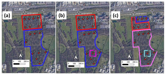 Recently, cost-effective soundscape assessment tools have successfully been applied to traffic noise mapping in urban areas, examples of which can be found for the cities of Madrid [21], Rome [22], Paris [23], and Rotterdam [24]. In particular, in ref. [25], the authors developed the dynamic mapping of traffic noise over a large area based on a limited number of monitoring stations. This result could be achieved by statistically grouping roads with similar traffic noise behaviour. The idea of extending this concept to natural environments is now becoming a strong requisite across all fields of eco-acoustics and bio-acoustics. In this regard, managing the influence and impact of urbanisation on green areas by monitoring across spatiotemporal continua could provide biodiversity estimation and useful information for conservation planning and development decisions. The capability of eco-acoustic indices to capture different sound features has been harnessed to identify areas within the Parco Nord of Milan characterised by different degrees of anthropic disturbances and biophonic activity. The area of Parco Nord of Milan has been the object of previous studies. More specifically, in ref. [26], the analysis of a 60 h recording allowed to distinguish among different biophonic activities during the day by applying an unsupervised statistical analysis. A further study based on the analysis of the auto-correlation between the time series of the computed eco-acoustic indices at two sites in the same area of Parco Nord allowed extracting indications on the environmental quality of the park [27]. Here, we are putting together the concept of spatial mapping developed in [25] with the information on the sound characteristics carried by different eco-acoustic indices as developed in [28] to obtain a spatial map of different sound blends over an area of approximately 20 hectares (not previously studied). To make this task cost-effective, we employed a network of very low-cost sensors distributed on a regular grid to highlight areas with different acoustic properties. The analysis described in this paper represents a contribution to establish a methodological approach in developing maps of environmental sound and eventually of environmental sound “quality”.