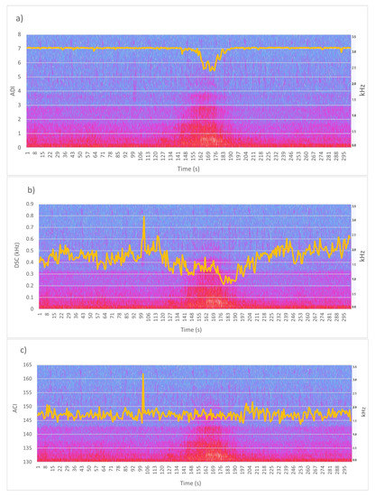 Spectrogram of a take-off overlapped with the ADI (a), DSC (b), and ACI (c) indices. Time scale 0–5 min.